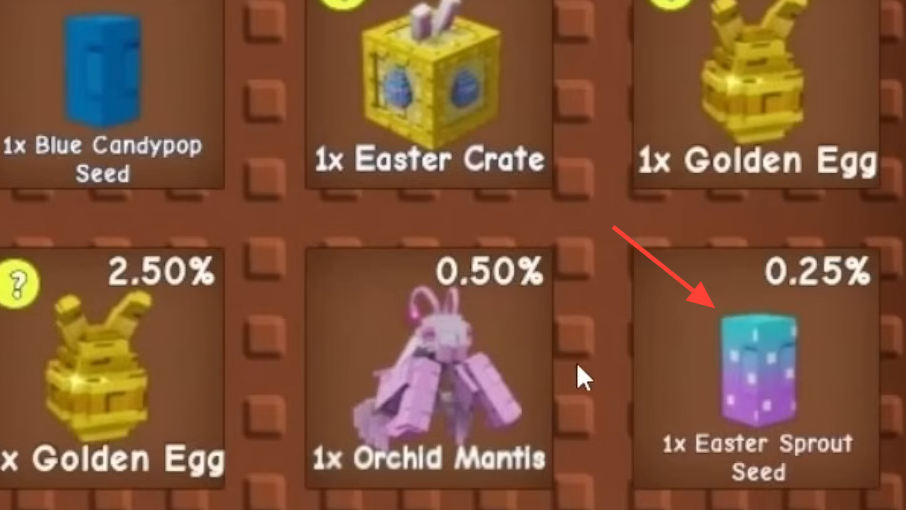 The Easter Sprout Seed at 0.25% and the Orchid Mantis at 0.50% are the rarest drops. If you're farming for these, sacrifice your highest-rarity crops to maximize reward quality. The Blue Candypop Seed is the most common non-currency reward at 27%, making it relatively easy to collect.