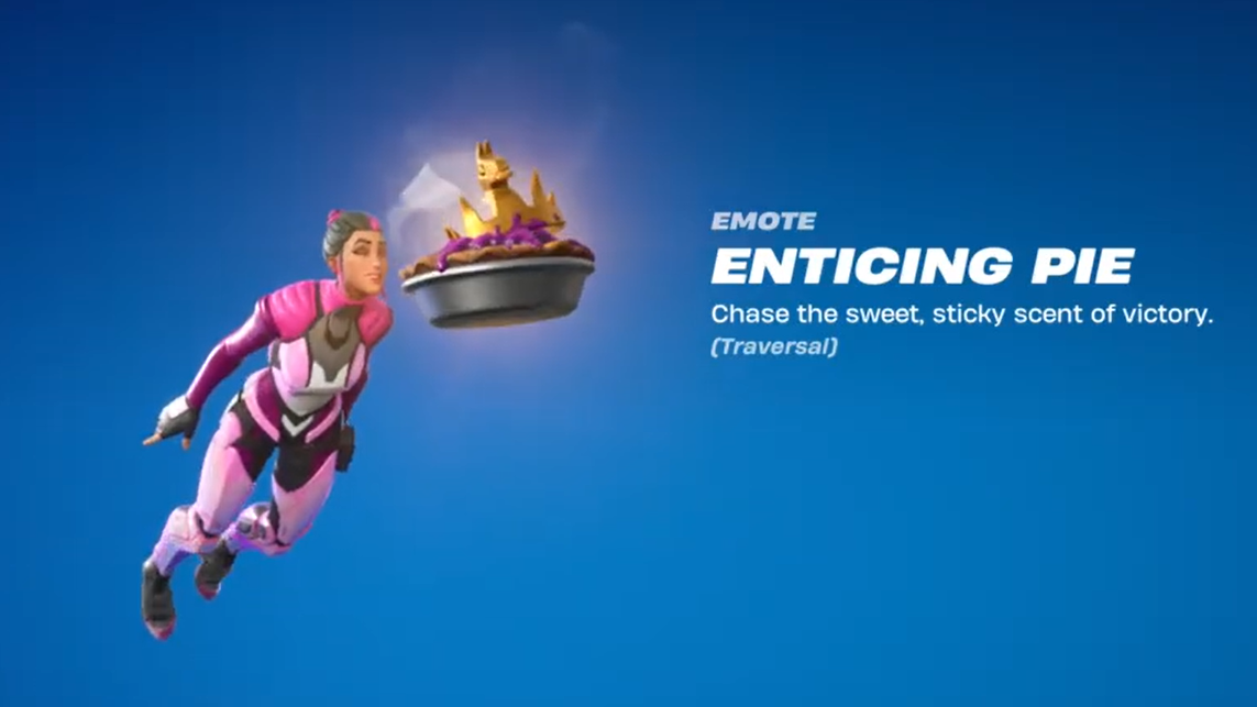 Enticing Pie is an Uncommon traversal emote in Fortnite — meaning your character walks while performing it — and it's currently available for free. The emote carries the in-game description "Chase the sweet, sticky scent of victory," and it pairs especially well with skins like Peter Griffin.