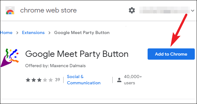 To get the Google Meet Party button, you need to download the Chrome extension. Open the Chrome web store on your browser and search for ‘Google Meet Party Button’. Or, you could also click here to dart there in a flash.