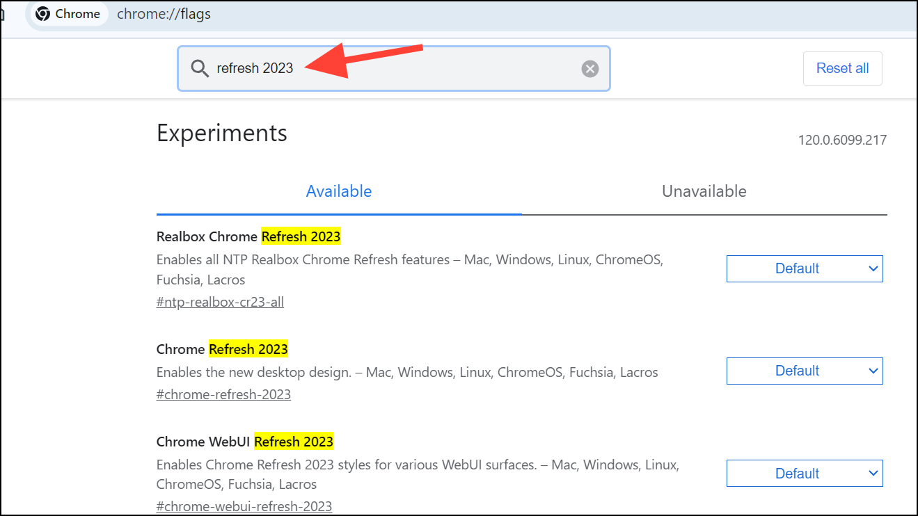 Step 3: Use the search bar at the top of the page to find the relevant flags by typing refresh 2023.