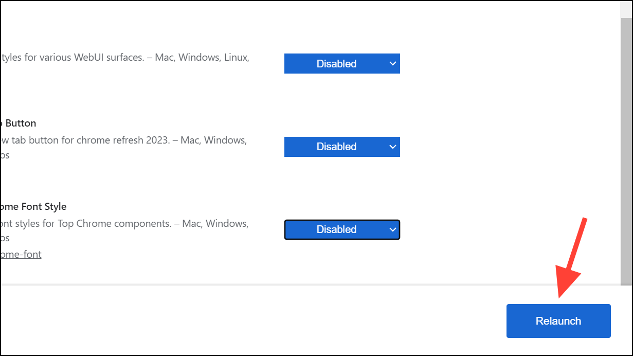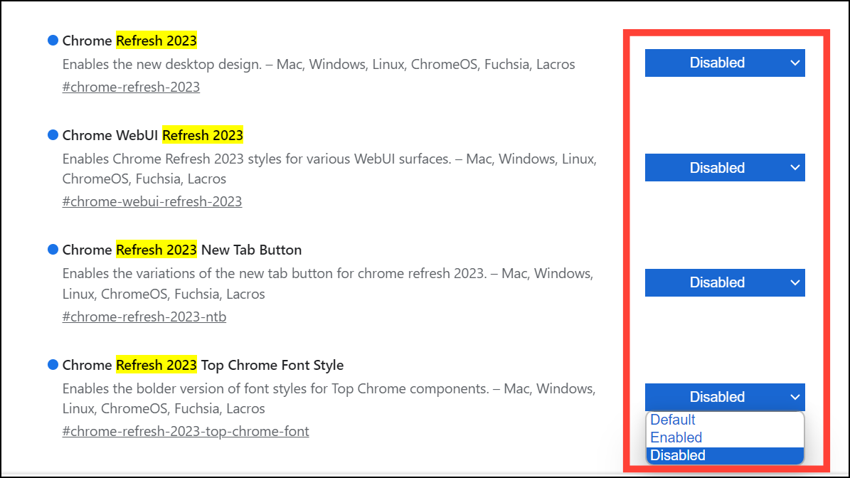 Step 4: Locate the following four flags: Chrome Refresh 2023, Chrome WebUI Refresh 2023, Chrome Refresh 2023 New Tab Button, and Chrome Refresh 2023 Top Chrome Font Style. For each flag, click the dropdown menu on the right and select Disabled.