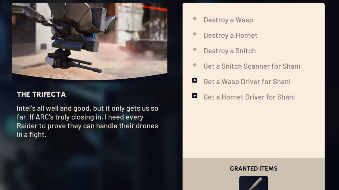 Shani’s early questline includes a step that directly uses Wasp Drivers. After finishing her earlier quest “Down to Earth”, she offers “The Trifecta”. That task focuses on three ARC machine types and their signature parts.