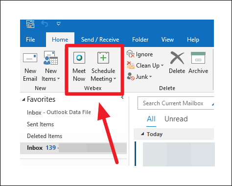 Step 7: You should now see the WebEx add-in available under the 'Home' tab in Outlook, featuring options like 'Meet Now' and 'Schedule Meeting'.