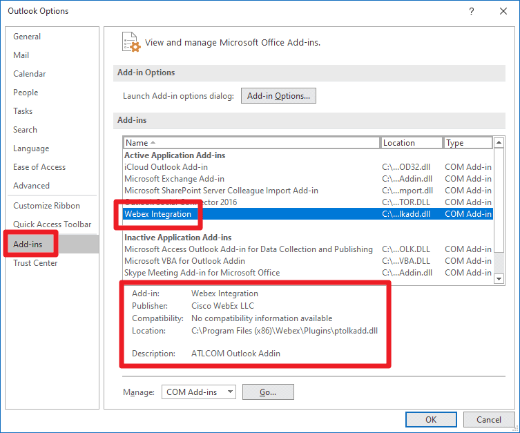 Step 3: Look for 'WebEx Integration' in the list. If it's listed under 'Disabled Application Add-ins', you'll need to enable it.