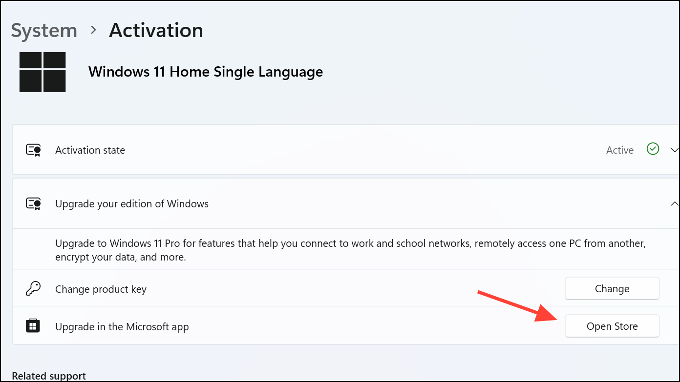 Step 2: Under the activation settings, you'll see an option labeled "Upgrade your edition of Windows." Click on "Open Store."
