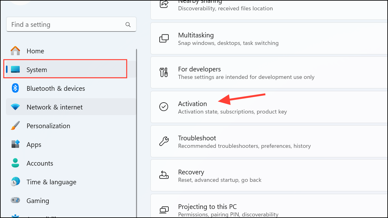 Step 1: Open your Windows 11 Home device and navigate to "Settings." From there, select "System," then click on "Activation."