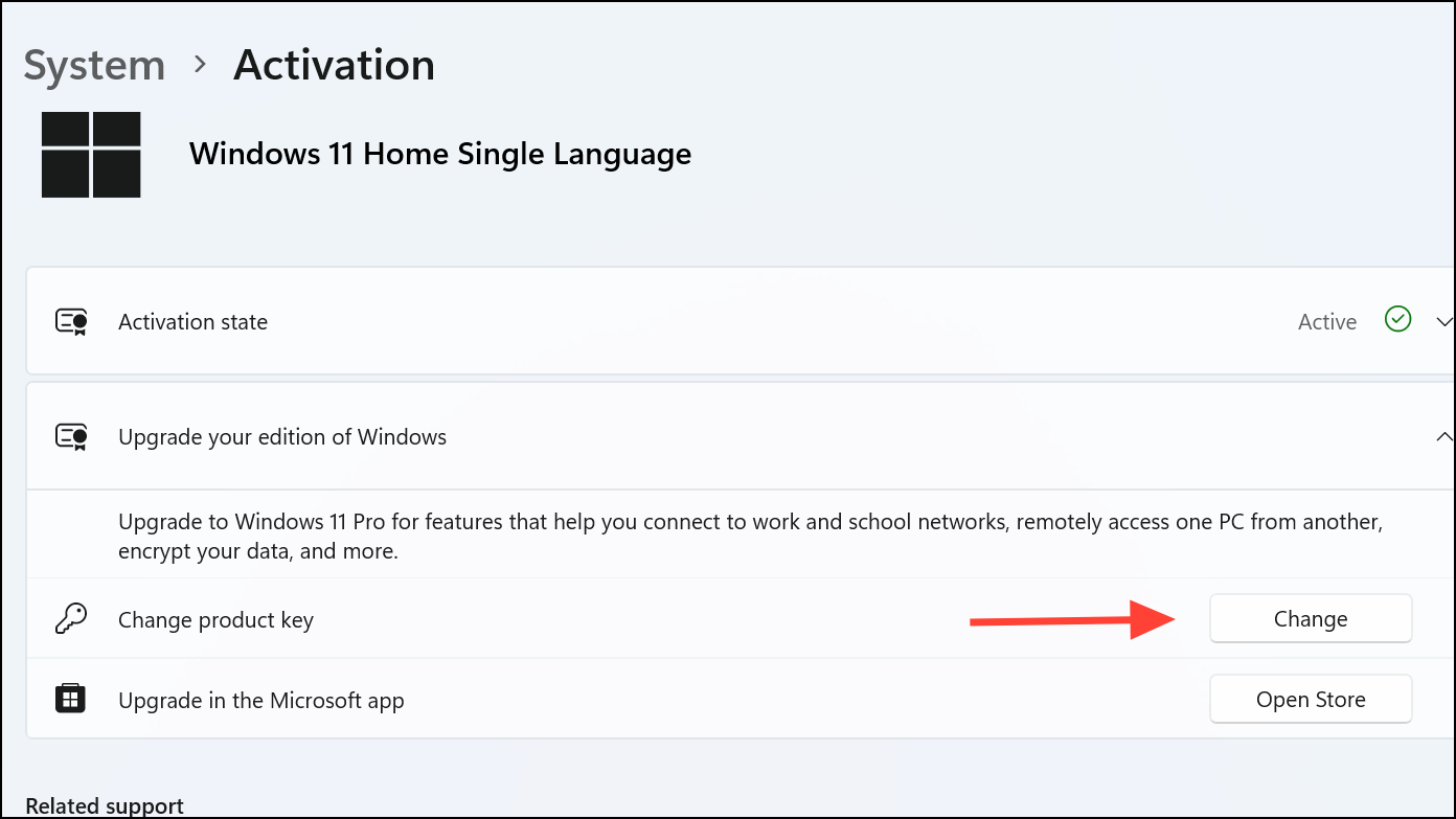 Step 7: Click on "Change product key." Enter the license key you received and follow the prompts to complete activation. After successful activation, your system will confirm that you're running Windows 11 Pro.
