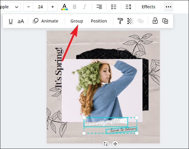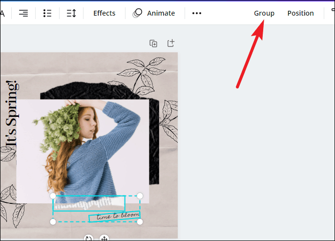 Grouping elements in Canva is rather straightforward. Select the elements you want to group. You can select multiple elements by either clicking and dragging your cursor across them. Or press and hold the Shift key and click each element while holding it down.