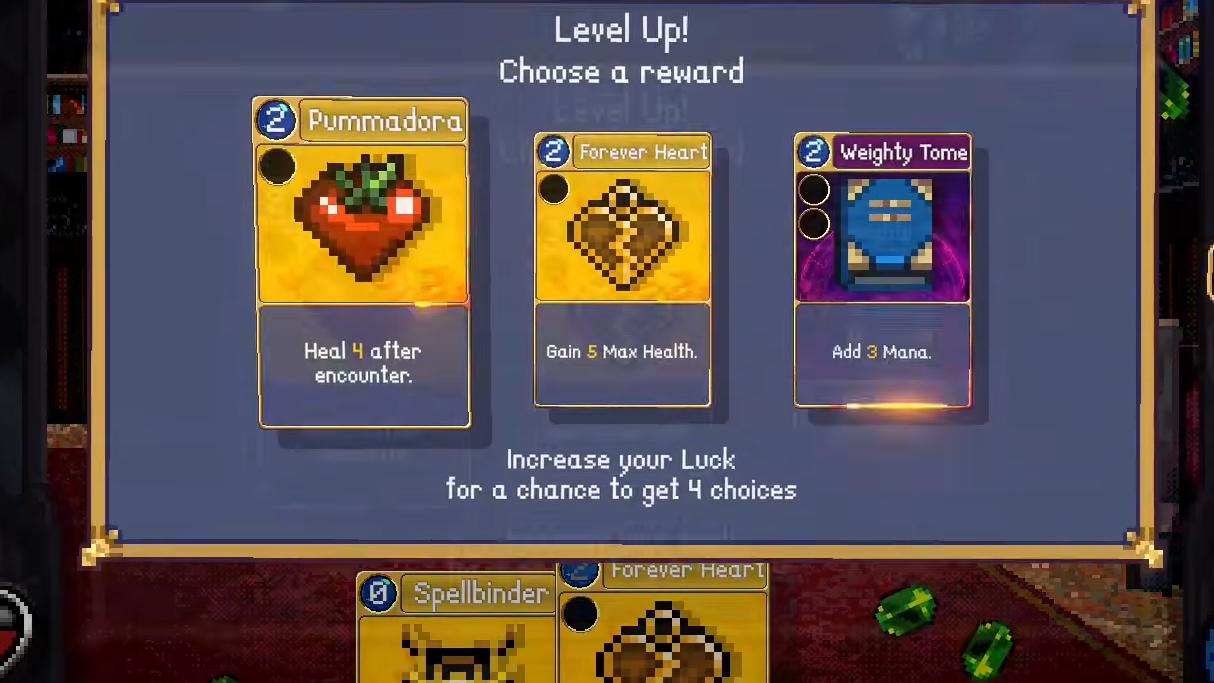 Vampire Crawlers keeps health tight on purpose. Early runs give you almost nothing to work with beyond roast chickens hidden in torches, and only later do real sustain options open up through power ups, a specific Crawler, card evolutions, Gems, and Arcanas.