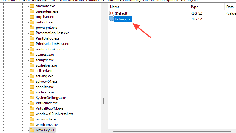 Step 4: Right-click on the newly created key (e.g., "example.exe"), select "New", and then "String Value". Name this new value "Debugger".