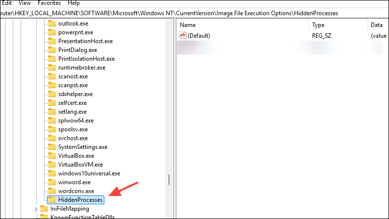 Step 6: For each process you want to hide, create a new String Value under the "HiddenProcesses" key. Name each value exactly as the process executable (e.g., "example1.exe", "example2.exe").