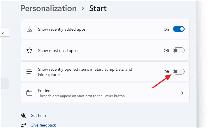 - Toggle off the option Show recently opened items in Start, Jump Lists, and File Explorer.