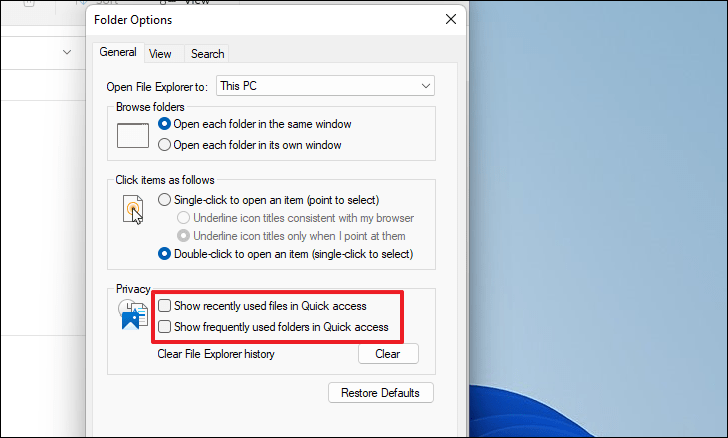- In the Folder Options window, under the Privacy section, uncheck the boxes next to Show recently used files in Quick access and Show frequently used folders in Quick access.
