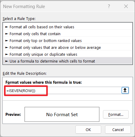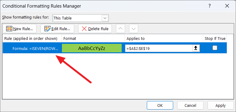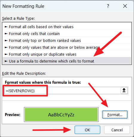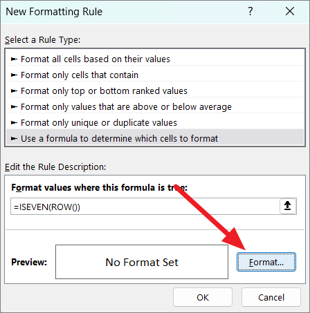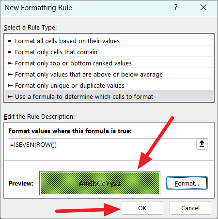 =ISEVEN(ROW())After entering the formula, use the ‘Format’ option to specify the formatting you want to apply to the even rows just like we did in the previous method. Then, click ‘OK’ to save the rule and get back to the Conditional Formatting Rules Manager.