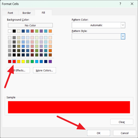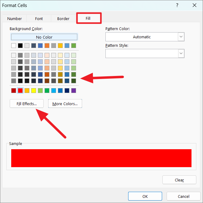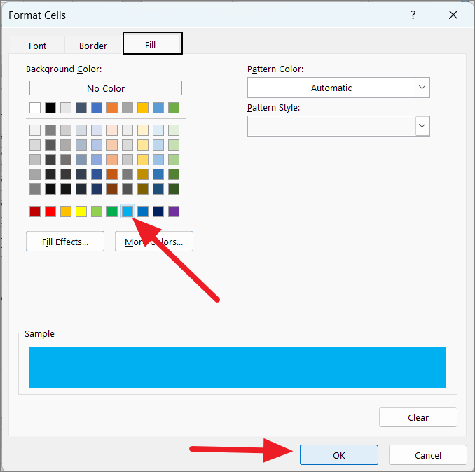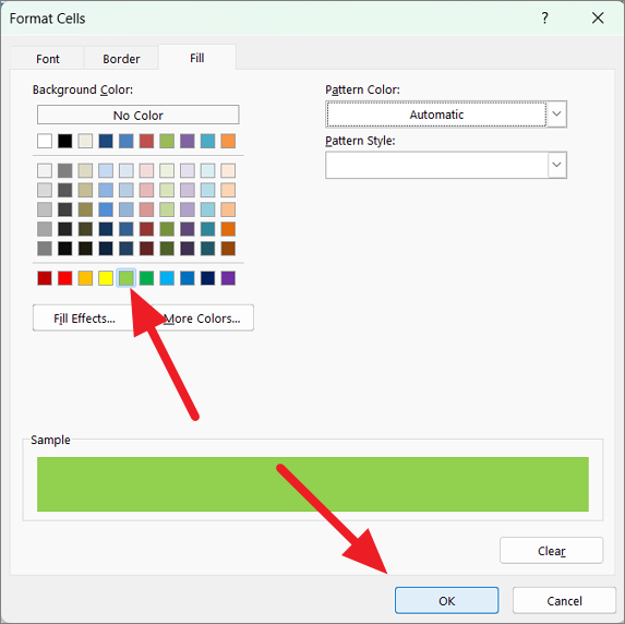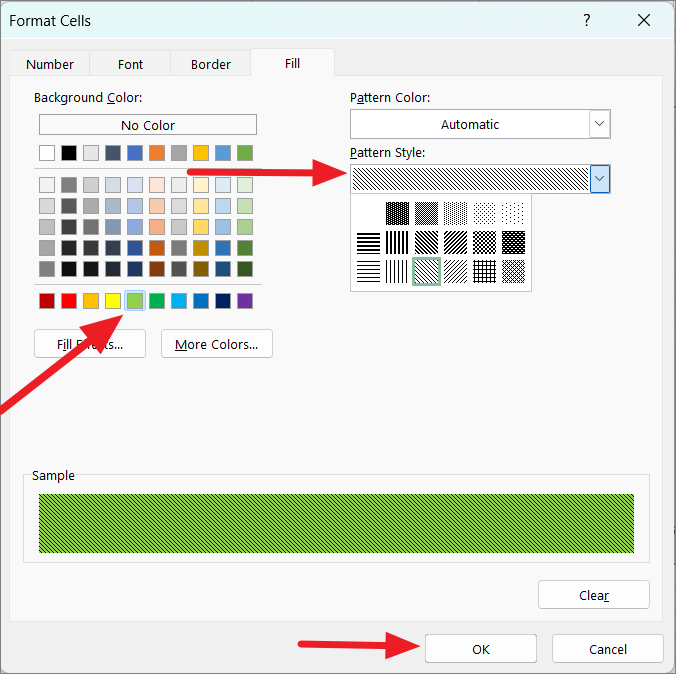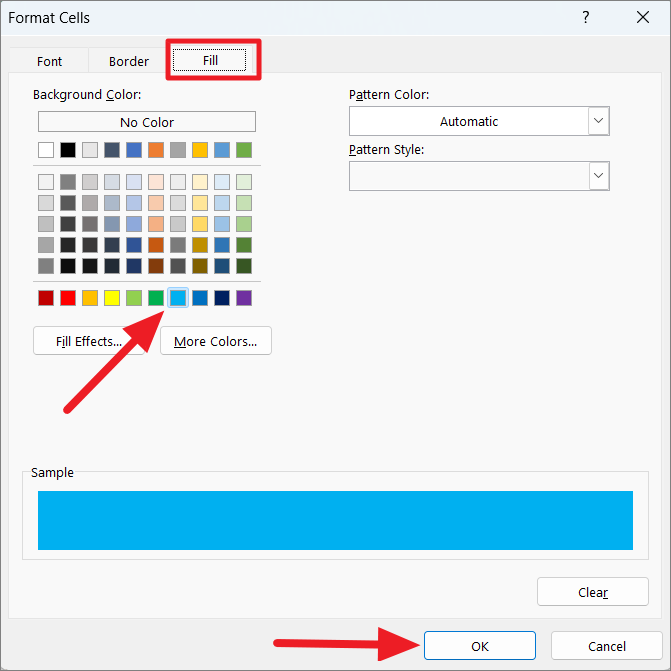 In the Format Cells dialog box, switch to the ‘Fill’ tab and choose the color for highlighting. You can choose a pattern style for the fill color from the ‘Pattern Style’ drop-down. Then, click ‘OK’.