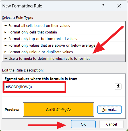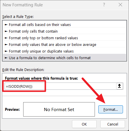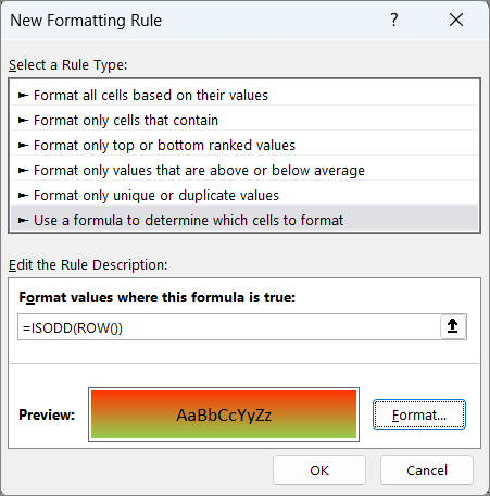=ISODD(ROW())The above formula is used to determine whether the row is even-numbered or not. Next, click the ‘Format’ button below to specify the formatting you want to use highlight the alternate rows.