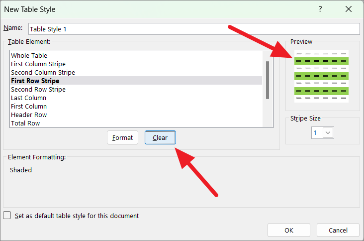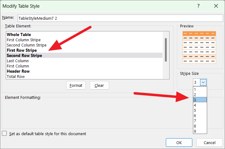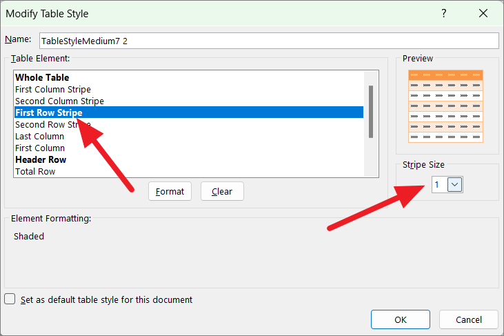 This will open the ‘Modify Table Style’ dialog box. Here you can change the stripe size to customize the shading area.