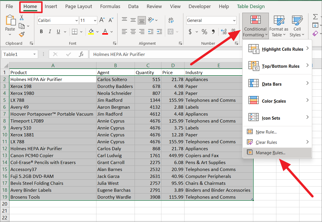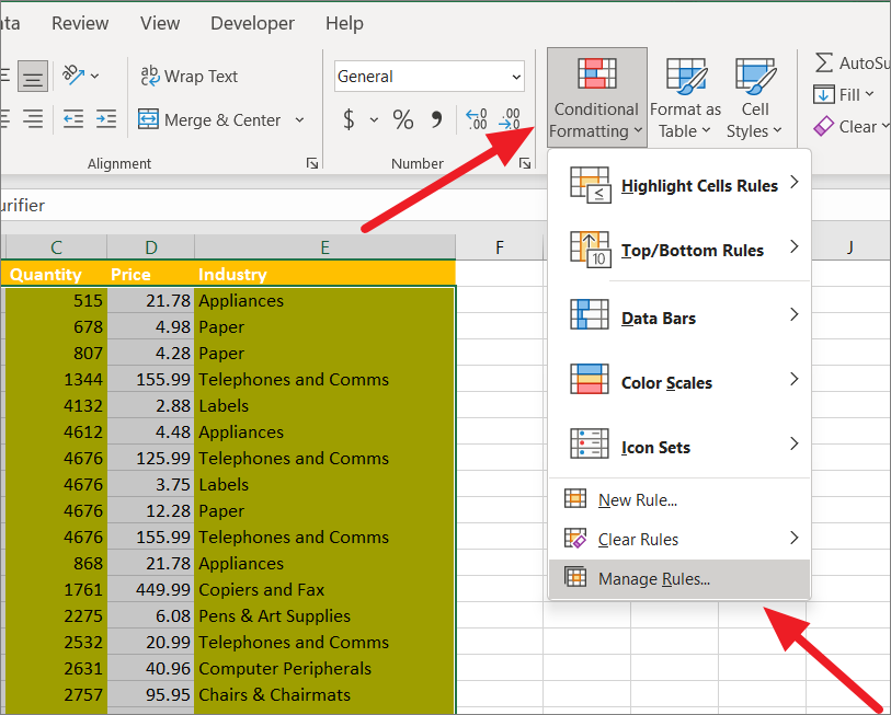 First, select the dataset and then open the Conditional Formatting Rules Manager by clicking the ‘Conditional Formatting’ menu in the ‘Home’ tab and selecting ‘Manage Rules…’.