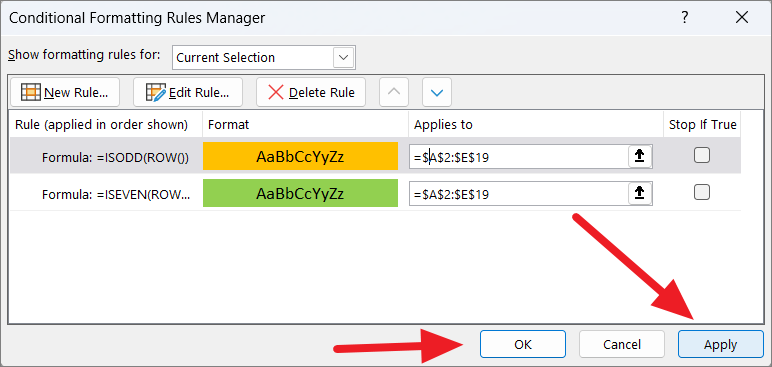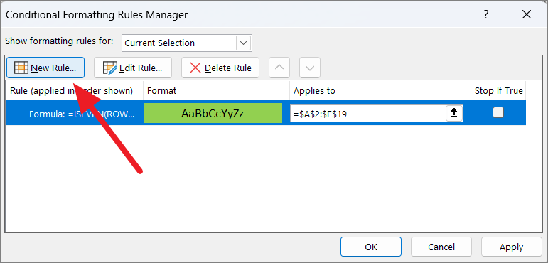 If not, you have to add two conditional formatting rules one for ISEVEN and another for ISODD. To do that, click the ‘New Rule…’ button.
