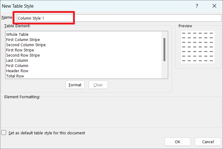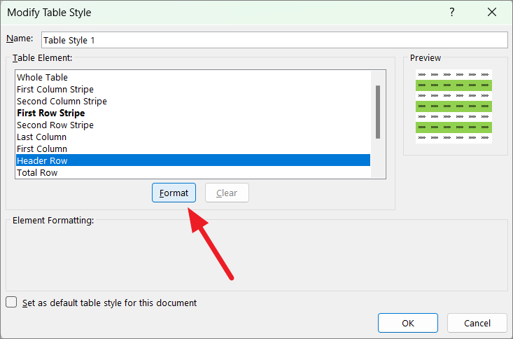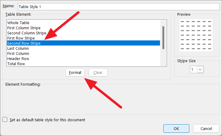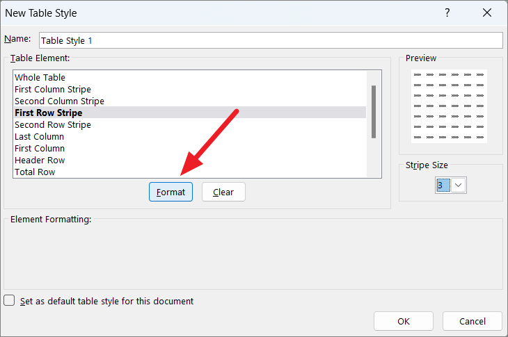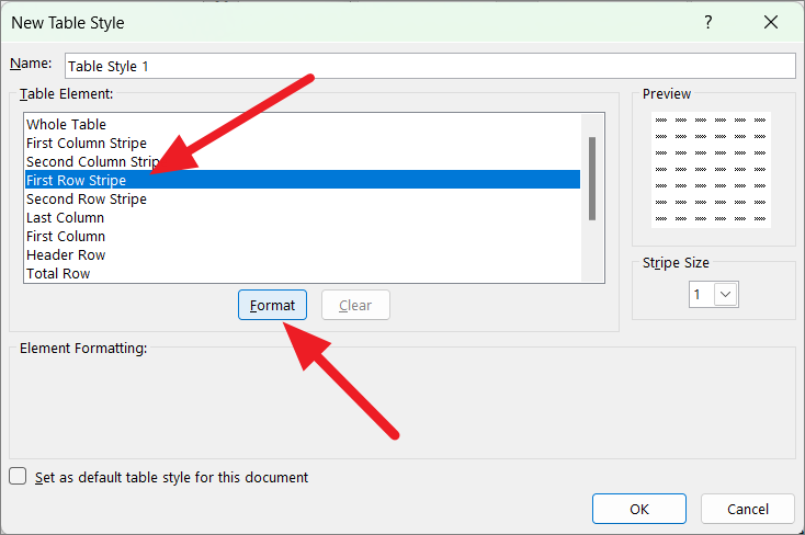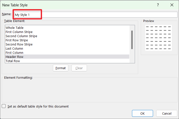 In the New Table Style dialog, give a name to the custom table style or continue with the default name. Under the Table Element, you can choose various table elements of the table and format them however you want.