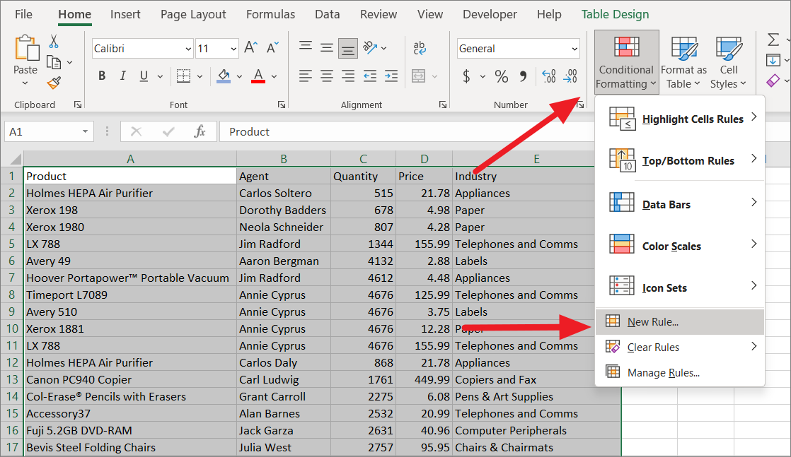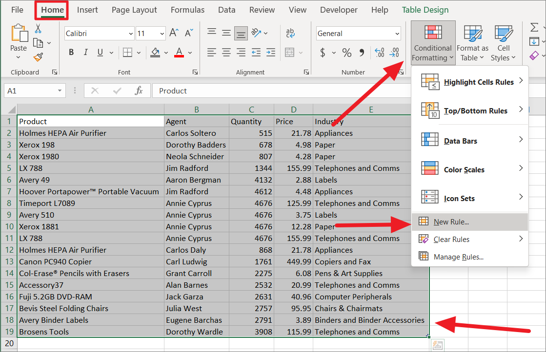 First, select the dataset where you want to highlight. Then, from the ‘Home’ tab, click the ‘Conditional Formatting’ button in the Styles section. From the drop-down menu, select the ‘New Rule…’ option.