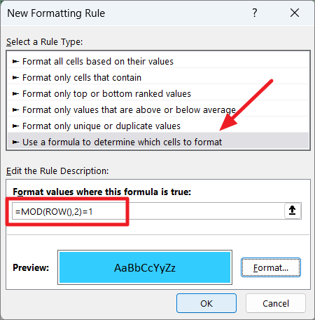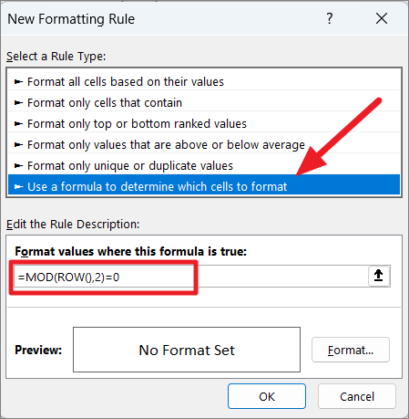 Now follow the same instructions, enter the below formula in the Edit the Rule Description box, specify the formatting for odd rows, and click the ‘OK’.