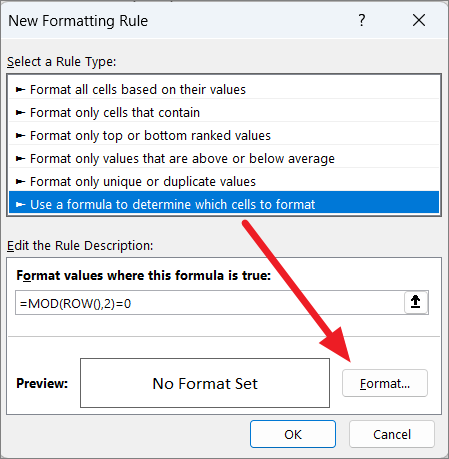 Next, click the ‘Format’ button below to specify the formatting you want to use highlight the alternate rows.