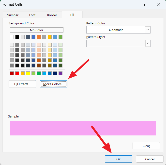 In the Format Cells window, go to the ‘Fill’ tab and pick a color and if you can’t find the color you want in the preset options, select the ‘More Colors…’ button to get more colors. After selecting the color and formatting, click ‘OK’.