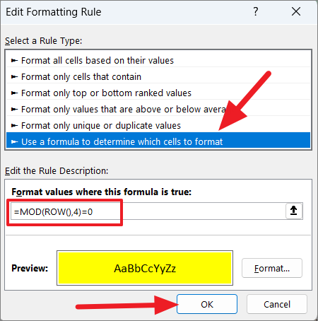 Here, the divisor is 4, so the MOD function divides each row number by 4 and returns ‘0’ as a remainder only when divided by every 4th-row number (4, 8, 12, etc.). Hence, only rows 4, 8, 12, 16, etc. will be highlighted.