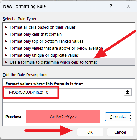 =MOD(COLUMN(),2)=0The nested COLUMN function finds and returns the column numbers which is then used as the number argument of the MOD function. The MOD function divides the column number by 2 and returns ‘0’ as a reminder for every even-numbered column. If the condition is TRUE, the alternate even rows get highlighted.