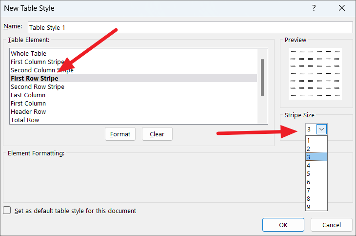 In the New Table Style dialog, name the table style and select the ‘First Row Stripe’ element, and set the ‘Stripe size’ to the number of rows you have in each banded group. Here, we are selecting ‘3’.