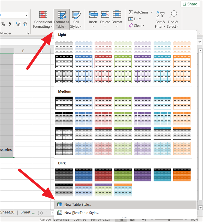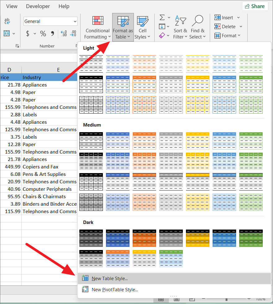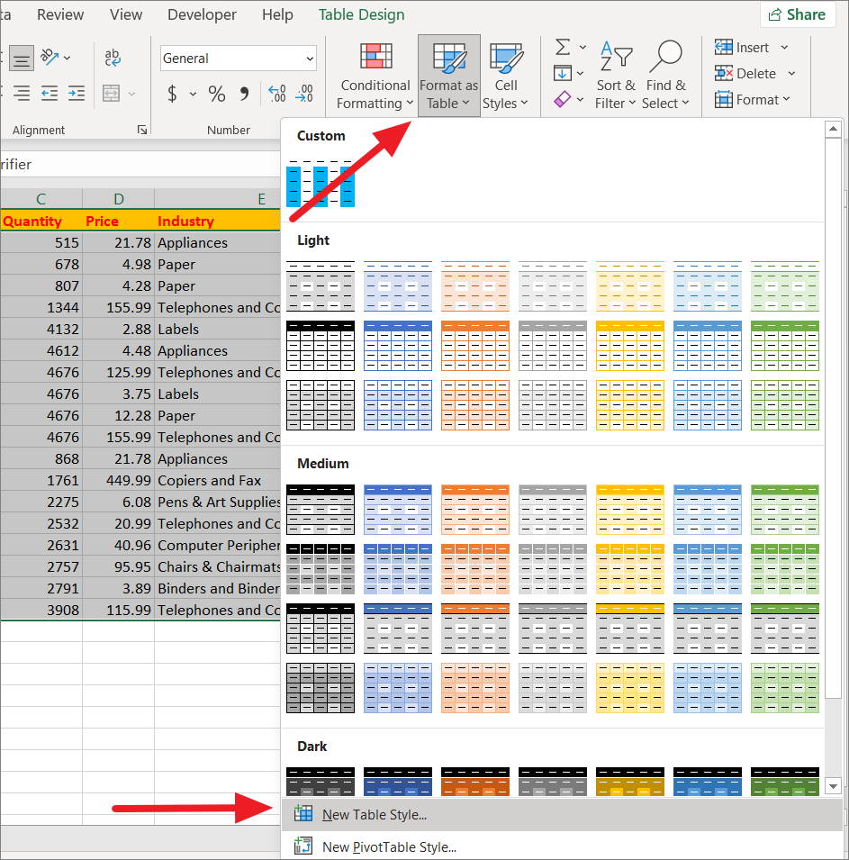 To create a custom table style, go to the ‘Home’ tab and select the ‘New Table Style…’ option from the bottom of the ‘Format as Table’ dropdown menu.