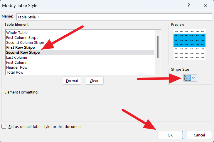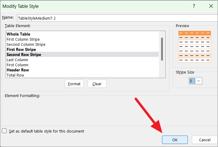Then, select the ‘Second Row Stripe’ and set the ‘Stripe Size’ to ‘3’. Then, click ‘OK’ to save the table style.