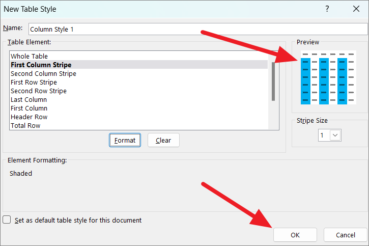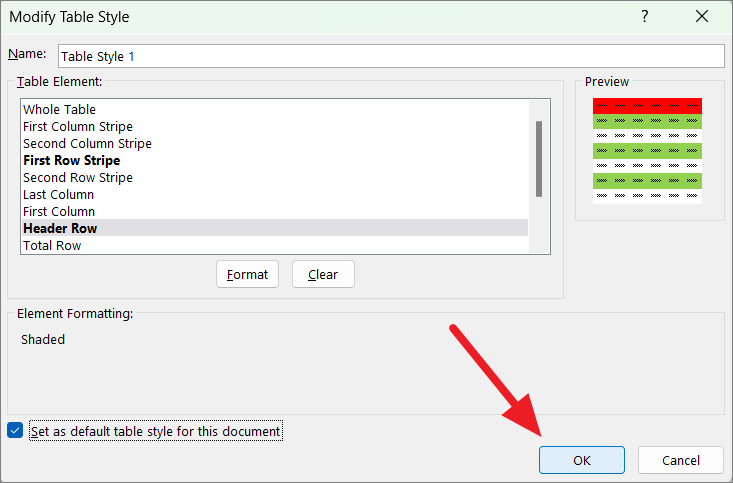 If you want to use this table formatting frequently, check the ‘Set as default table style for this document’ to make this the default style. After finalizing the color scheme, click ‘OK’ to save this table style.