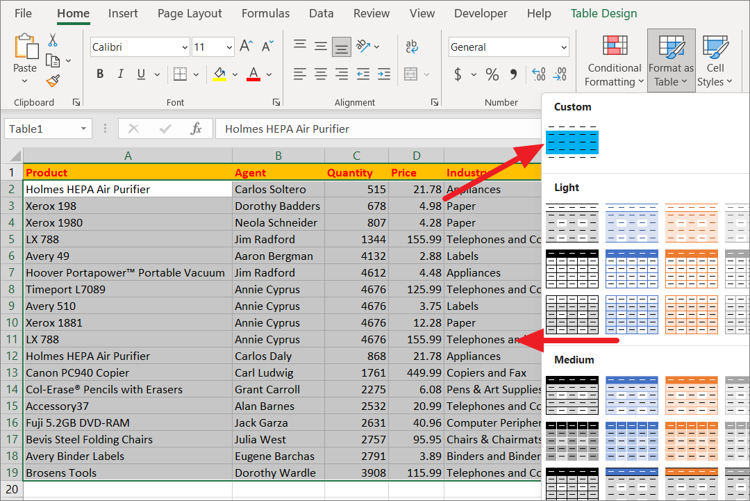 Once you created a custom table style, it will be added to the Custom section of the ‘Format as Table’ menu. Now select any cell in the range or the entire table range and choose your custom table formatting from the ‘Format as Table’ menu.