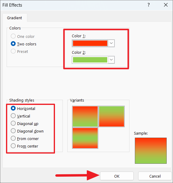 This will open another window named Fill Effects where you choose your gradient effects. Here, first, choose colors from the color drop-down. You can either select one color or two colors from the dropdowns. Here, we selected the red color from the ‘Color 1’ drop-down and the green color from the ‘Color 2’ drop-down.