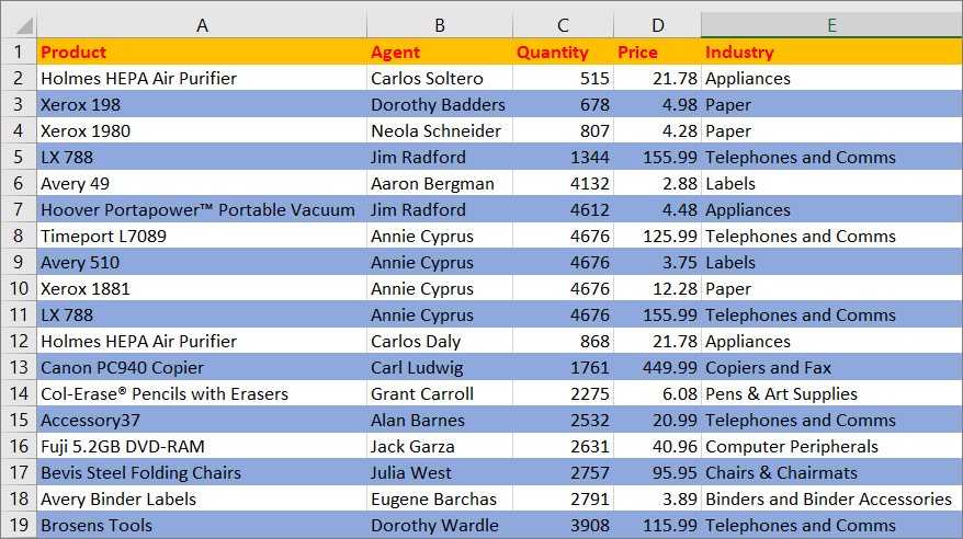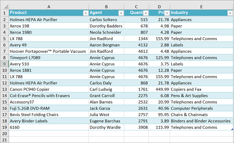 This will convert the range into a table, apply the selected table format, and color your alternate rows as shown below. In addition to this, it will also make your table dynamic with table functionalities, like sorting, filtering, etc.