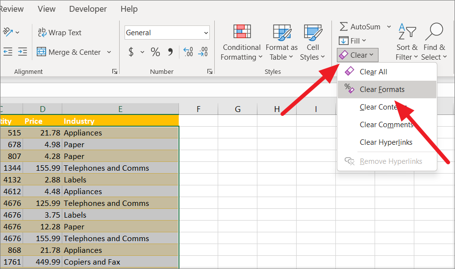 If you don’t want the rows to be highlighted anymore, select the table or the range and click the ‘Clear’ button in the Editing group of the ‘Home’ tab. Then, select ‘Clear Formats’ to remove all formatting from the range.