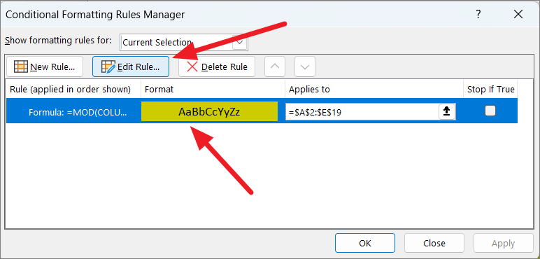 Another advantage of using the Conditional formatting method is that you can edit the formatting rule at any time to make changes to your highlight. For instance, if you already highlighted even rows in your table, you can easily edit the formula in the formatting rule to highlight odd rows. Here’s how you can do that: