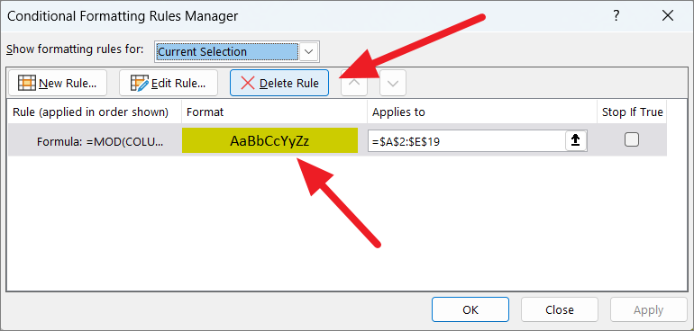 Then, select a specific rule from the Rule Manager and click ‘Delete Rule’ to remove the formatting.