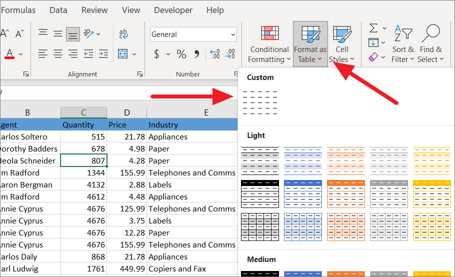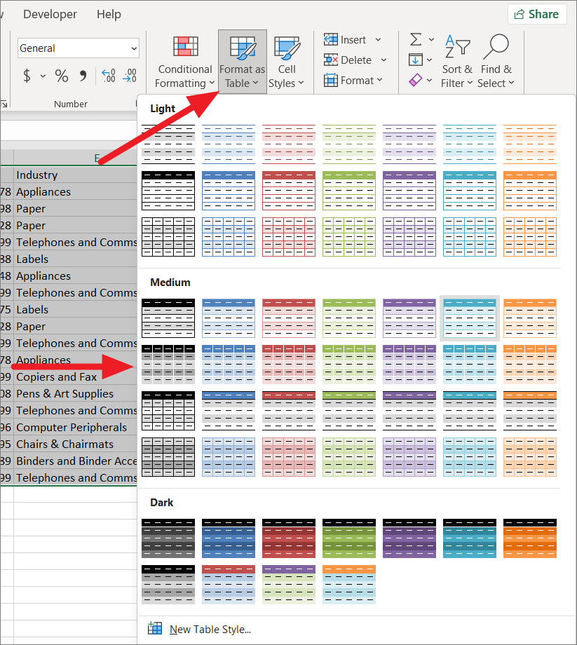 From the ‘Home’ tab, click the ‘Format as Table’ button in the Styles section. In the drop-down menu, select any of the formatting styles with banded rows (style with alternate row shading) from Light, Medium, and Dark sections.