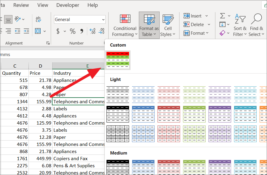 After that, select the range to apply the formatting and choose your custom table style from the ‘Format as Table’ menu.