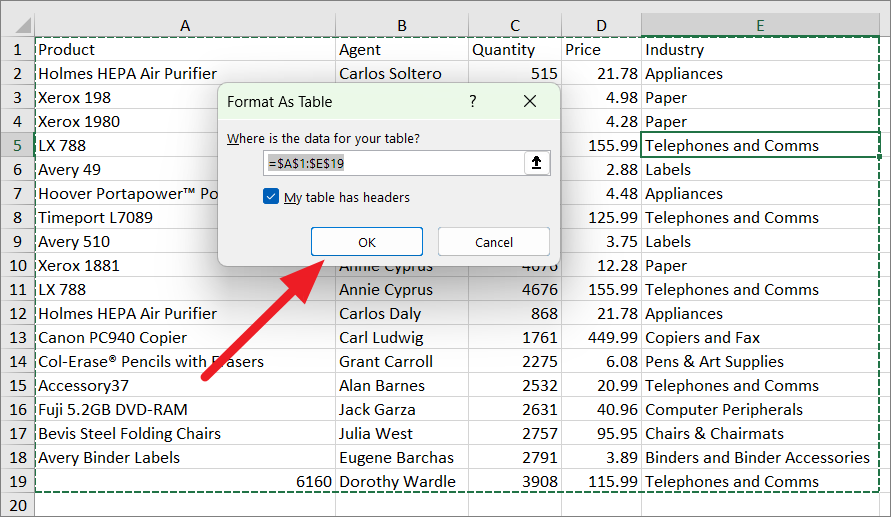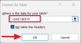Then, confirm the range in the ‘Format As Table’ box and click ‘OK’.