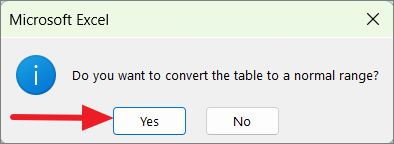 Select any cell in the table, right-click on it, hover over ‘Table’ from the context menu, and then select the ‘Convert to Range’ option.