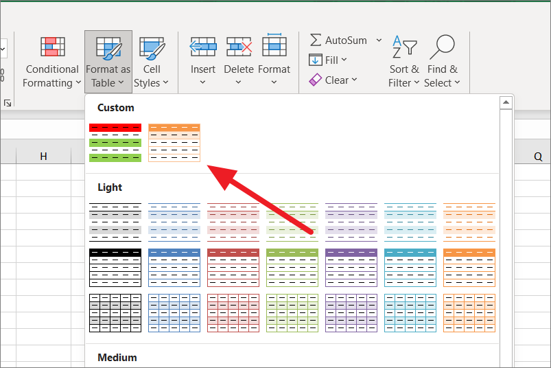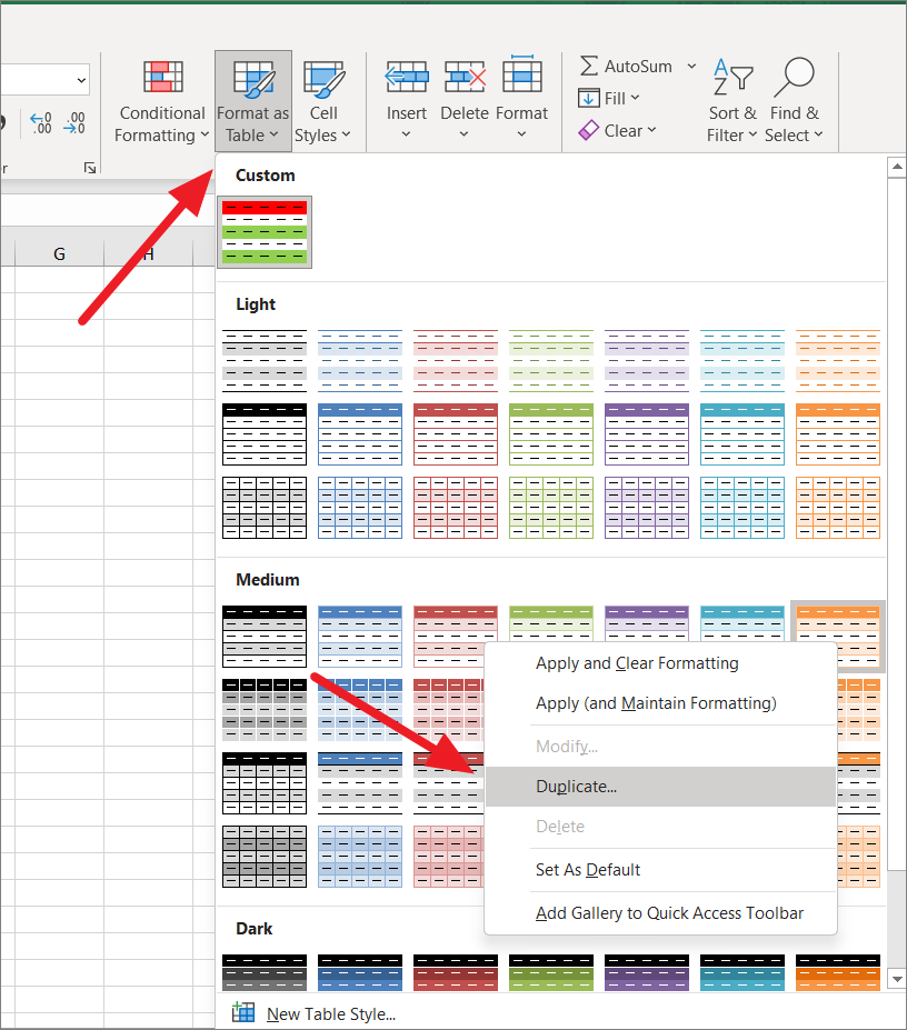 To do this, open the ‘Format as Table’ menu and right-click any table style option (Custom or built-in) that you want to apply, and select ‘Duplicate’ to edit it.