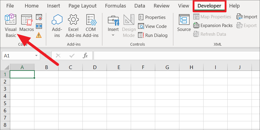 To open the Visual Basic for Applications window, go to the ‘Developer’ tab and click the ‘Visual Basic’ option from the ribbon or press Alt+F11.
