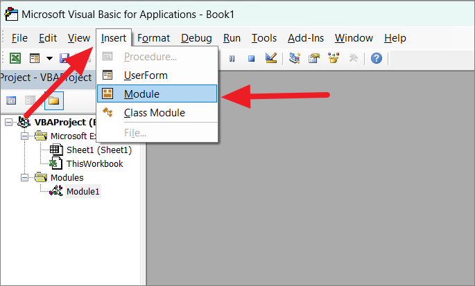 In the VBA window, click the ‘Insert’ tab, then select the ‘Module’.
