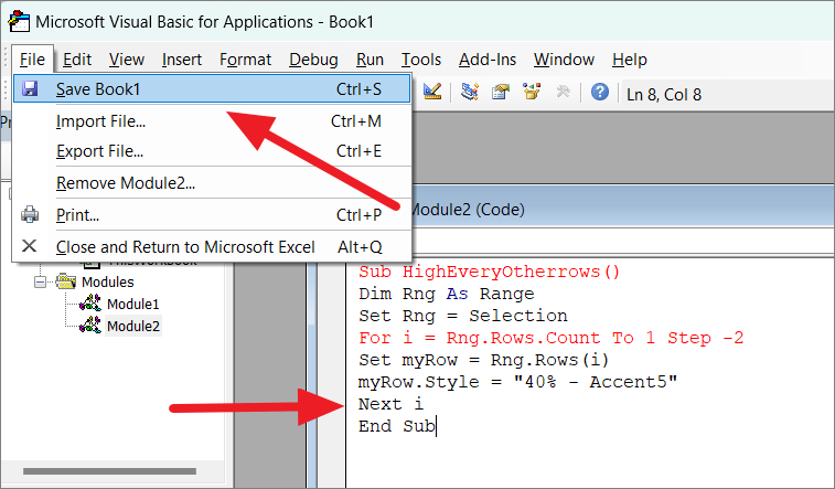After entering the code, click ‘File’ and select ‘Save’ to save this module as a macro which can be run any time you want.