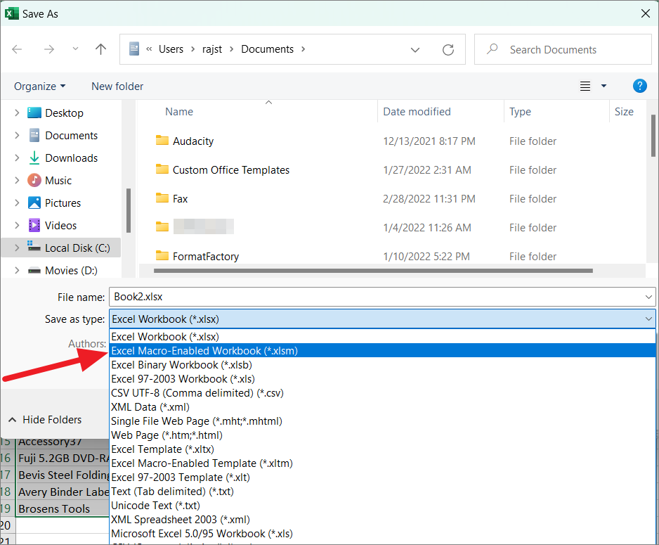 In the Save As window, choose ‘Excel Macro-Enabled Workbook (*.xlsm)’ format from the ‘Save As type’ drop-down and click ‘Save’.