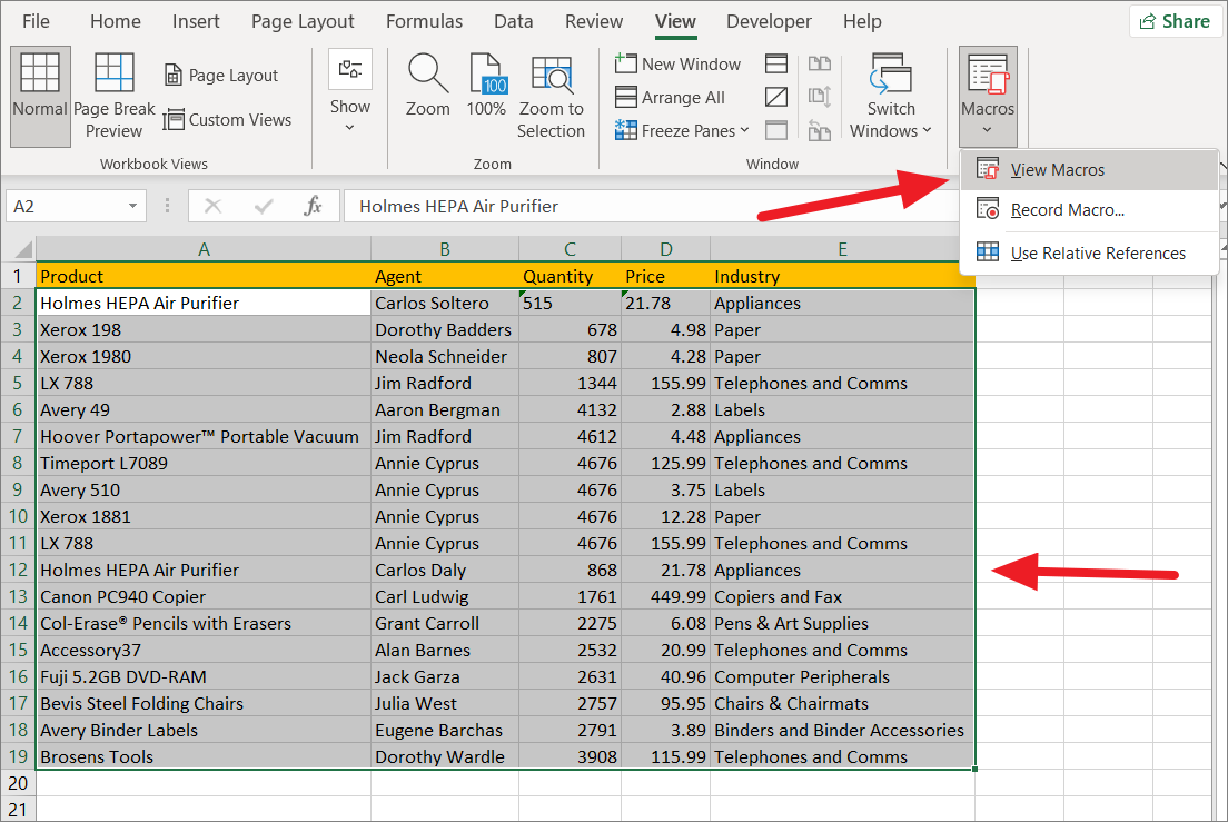 First, select the range where you want to highlight the alternate rows. If your table has a header, don’t include the header in the selection. Then, switch to the ‘View’ tab, click ‘Macros’ from the ribbon, and select the ‘View Macros’ option from the menu.